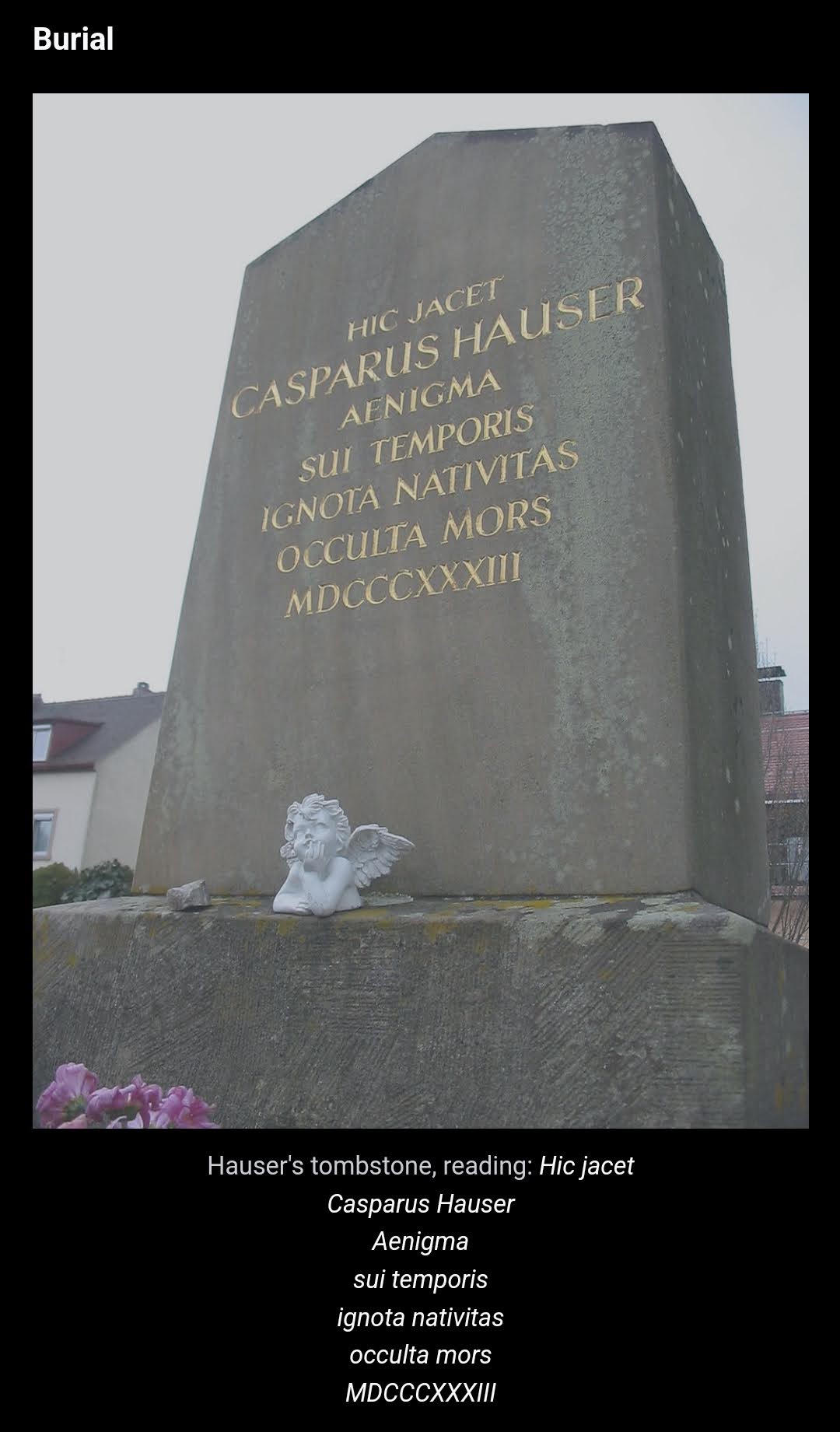 From Wikipedia, translates to: “Here lies Kaspar Hauser, riddle of his time. His birth was unknown, his death mysterious. 1833.”