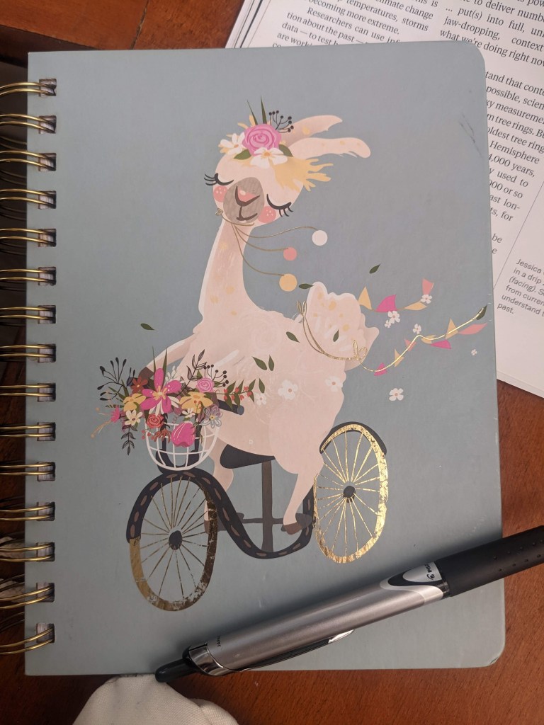 Today is a day I’ve dreaded for nearly a year: this morning I finished writing the last page of my beloved late Mama’s llama journal. I cried when I finished my last entry. I loved writing in this journal. My mom loved cute, kind of kitschy things, the type of little details and objects that would make her smile in her day-to-day. I’ve picked up this journal nearly everyday, the cover a carefree llama blissfully smiling while on a bicycle. Now that she is gone from the earthly plane, I get to think of her little moments of joy and sweetness that composed her inner landscape.